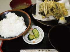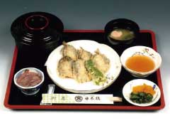 特産品のやまべをカリッと揚げた絶品定食。淡白なやまべの天ぷらが美味です。